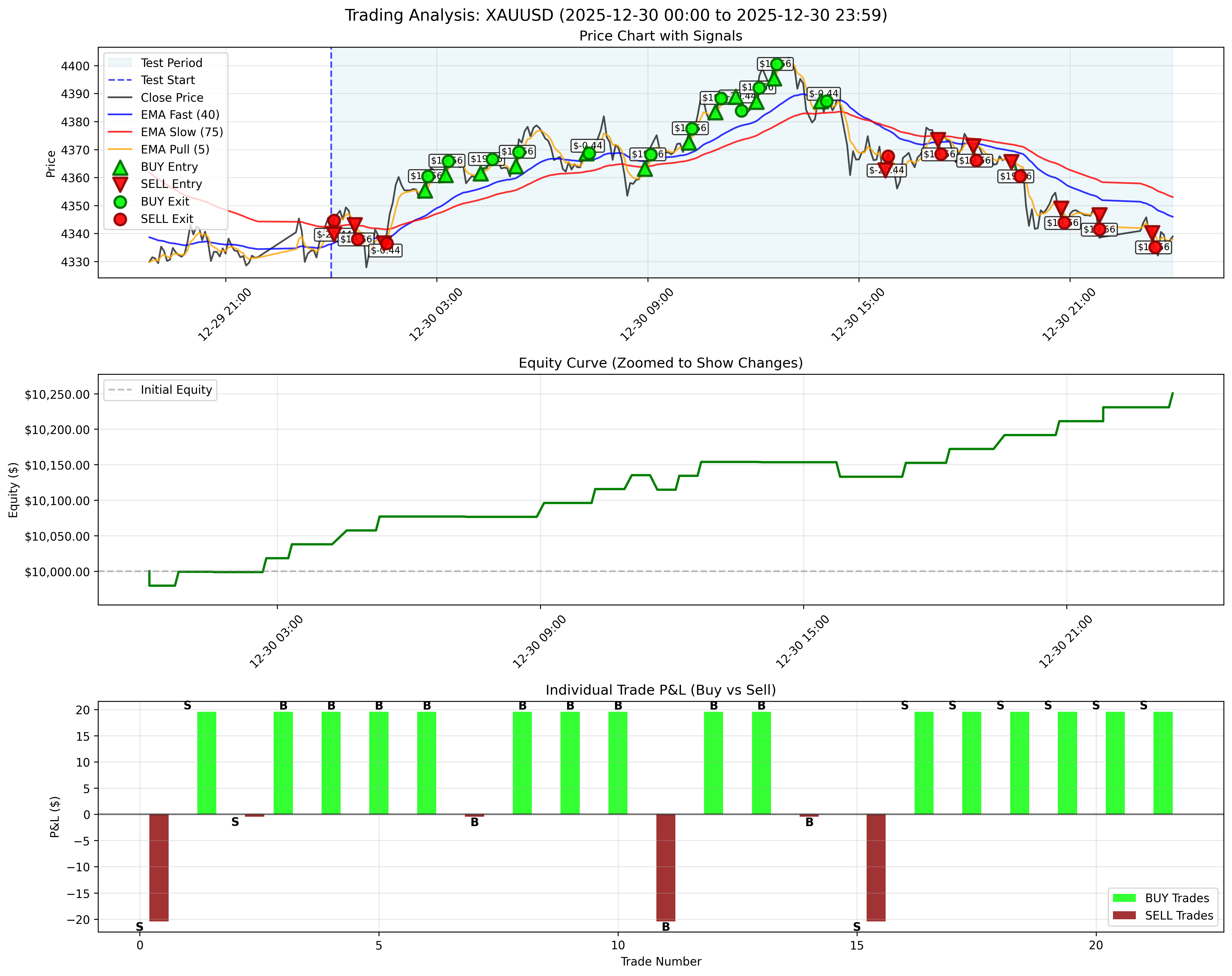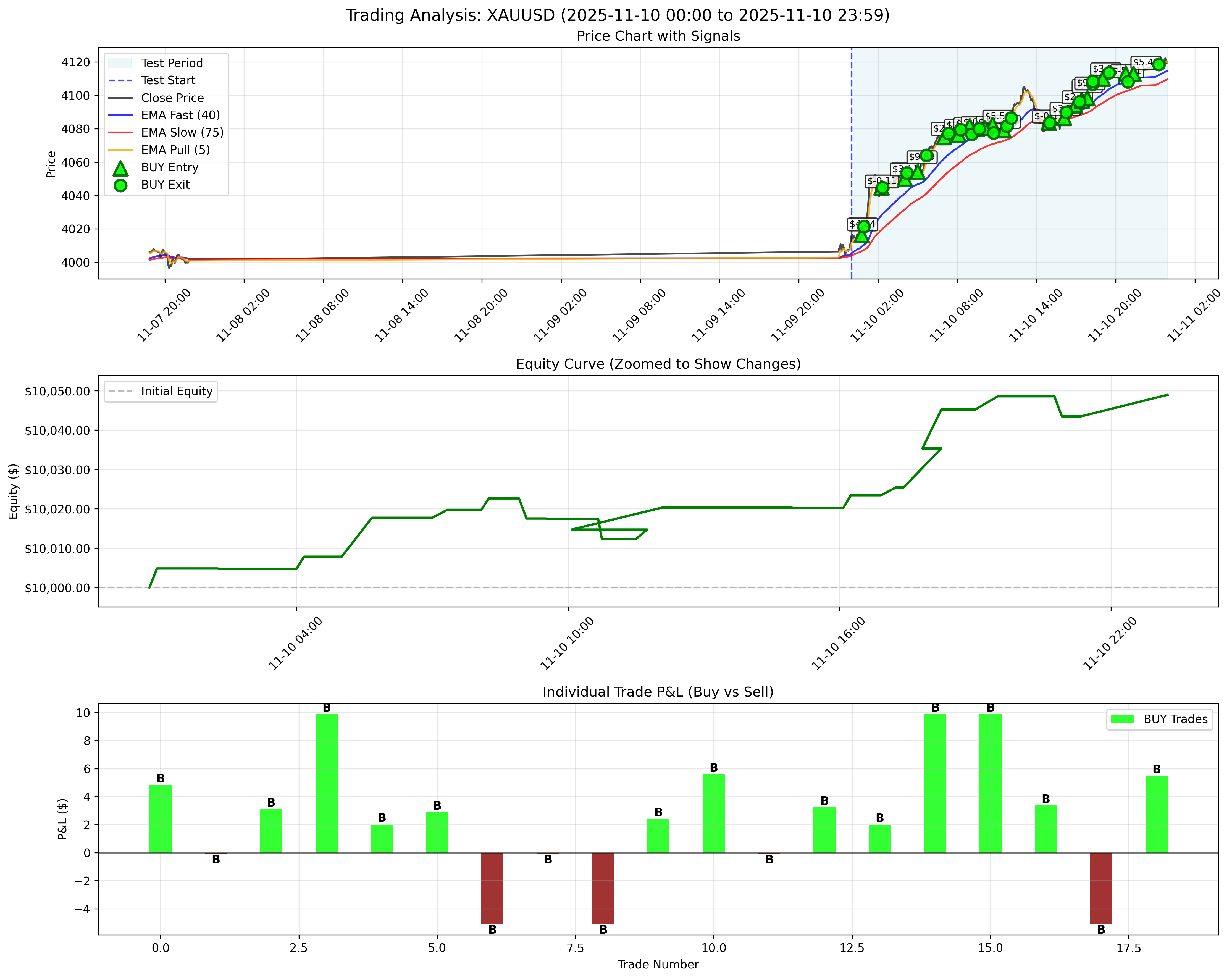 Comprehensive 22-day backtest results for our TREND strategy on XAUUSD (Gold) in November 2025. Achieved $213.68 net profit with 40.6% win rate across 449 trades. Plus live trading update: $150 profit from $2,000 capital in 20 days (7.5% return).